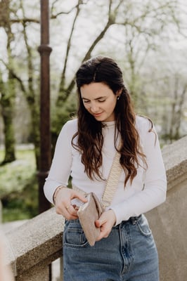 und mit goldener, silberner oder roségoldener Hardware (Karabiner, Reißverschluss etc.)