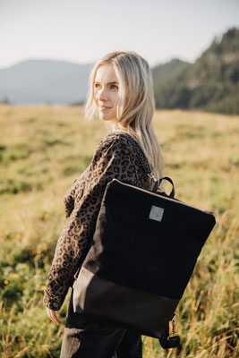 Zeitloser Backpack aus schwarzem Wild- und Glattleder (vegan).